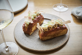 ● Mini chicken boudin hotdogs with onion and plum ketchup
