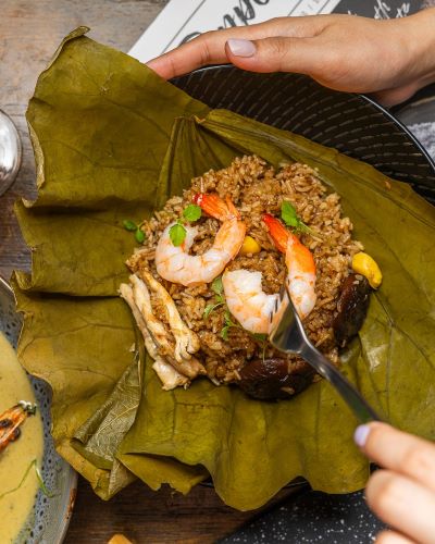 Unveiling a culinary delight, the Lotus Leaf Wrapped Rice, is a modern twist on a cherished family recipe from owner Tom, grandfather’s century-old restaurant in Sam Chuk, Suphanburi, Northern Thailand. Featuring fragrant rice, succulent prawns, tender chicken, mushrooms, and ginkgo, this dish encapsulates the essence of tradition with a contemporary flair. The lotus leaf wrapping enhances the aromatic experience, offering a journey through time and flavours.