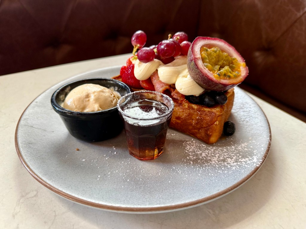 The coffee blend is from the multi awarded Wood Roaster in Marrickville, displaying a rich aromatic crema and distinctive flavour profile given the science of that method, which really showcases the characteristics of the particular bean being roasted. I went straight to a ristretto, more for purists than the faint hearted, and it was very professionally extracted. Good news also on the juice front, as everything is freshly squeezed and you can choose up to three combinations. Onto food, and my dining partner chooses the very thick brioche French toast from the breakfast menu, topped with bacon, fresh seasonal fruits, whipped mascarpone, maple syrup and served with salted caramel ice cream, and not surprisingly wants for no more. I choose the Earl’s burger from the lunch menu, a wagyu beef patty, with caramelised onions, American style cheese, tomatoes, pickles and mixed leaves; topped with smokey BBQ 5th Earl sauce and shoestring fries. Similarly, it was also enough for me, and looking around the whole tribe did not look famished from the servings. Unlike Michael Douglas’s character in Falling Down, they will let you mix and match, regardless of what time you arrive!