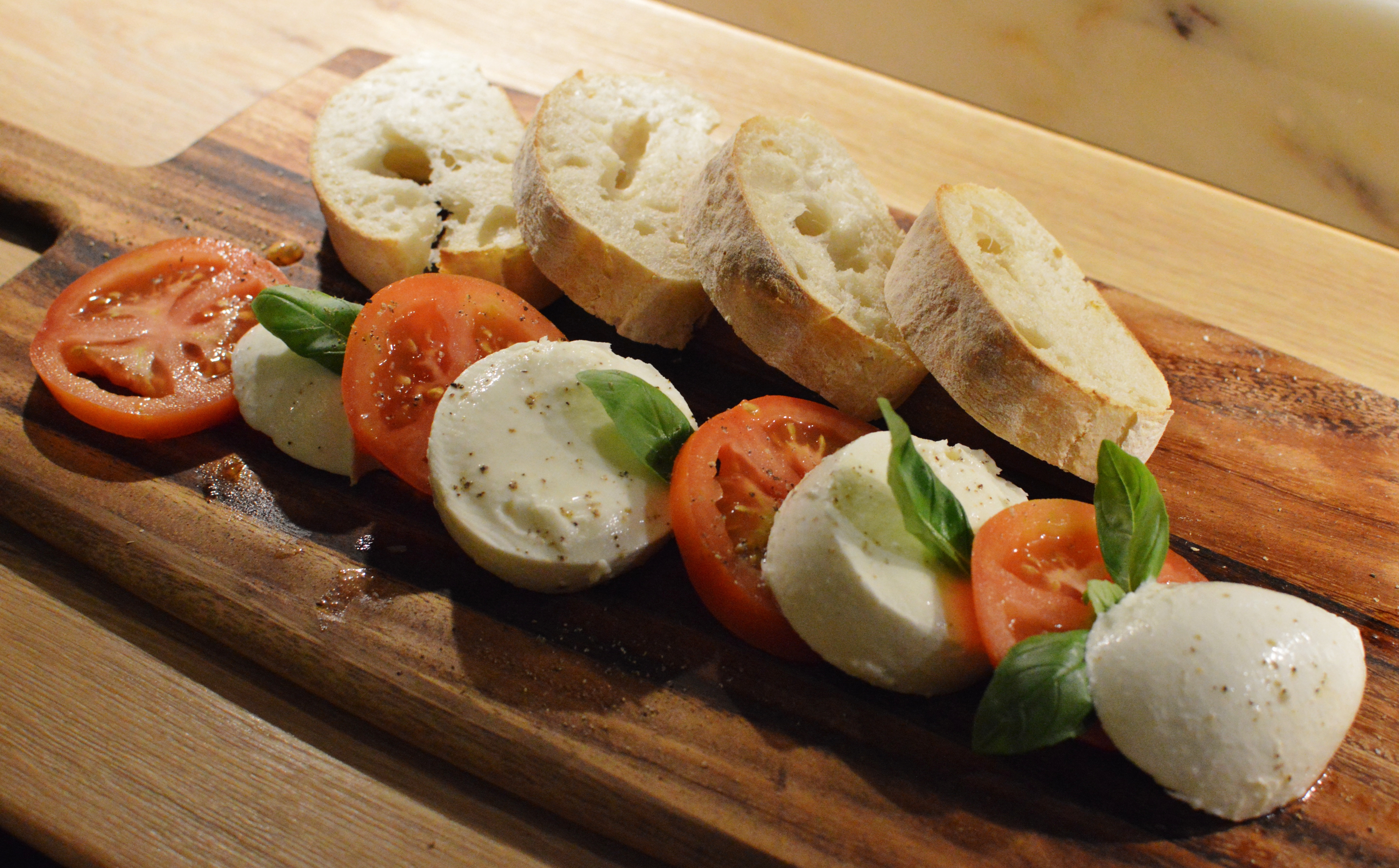 cut well toasted ciabatta rubbed with garlic, lashings of fresh tomatoes, and olive oil is mandatory, as is the Insalata Caprese ($12.90), a generous board of four ciabatta slices, buffalo mozzarella, ripe sliced tomatoes, and fresh basil. The Carpaccio of thinly sliced rare beef ($15.90), garnished with peppery rocket, benefits from a generous garnish of olive oil, which is