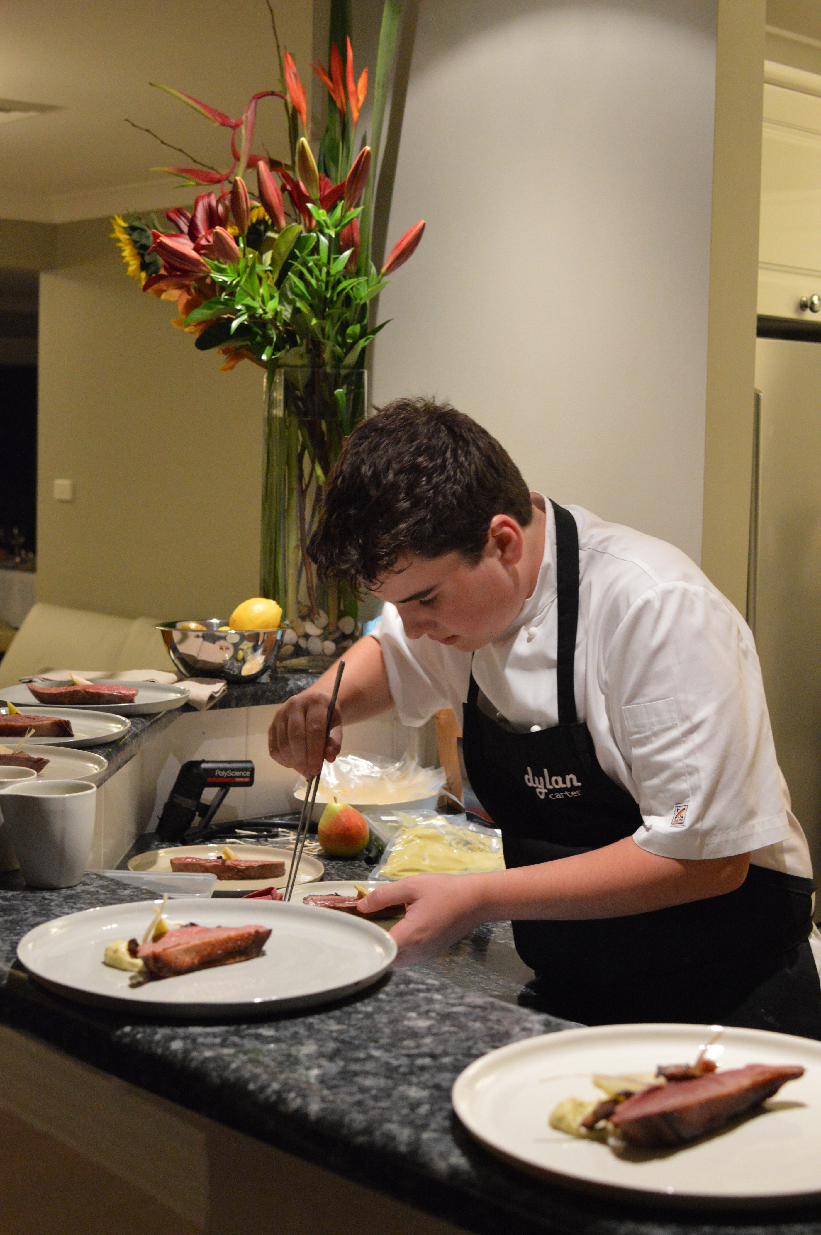 DylanIt is said if you are good enough, you are old enough. The success of young Chef Dylan Carter’s first pop-up restaurant certainly adds credence to that expression. Only just having turned fourteen, he has already staged at Ormeggio, Flying Fish, Biota Dining, Becasse, Pier, Assiette, Cutler and co, Vue de monde, Jacques Reymond, Attica, and Four in Hand. Clearly, his rare talent has been both recognised and nurtured by key figures within the Industry, and all things being equal, his future looks immensely promising. I have always maintained that an understanding of balance of flavours is a very intuitive skill, and there is no doubt that this gift underpins the quality of his food, even at this formative stage.