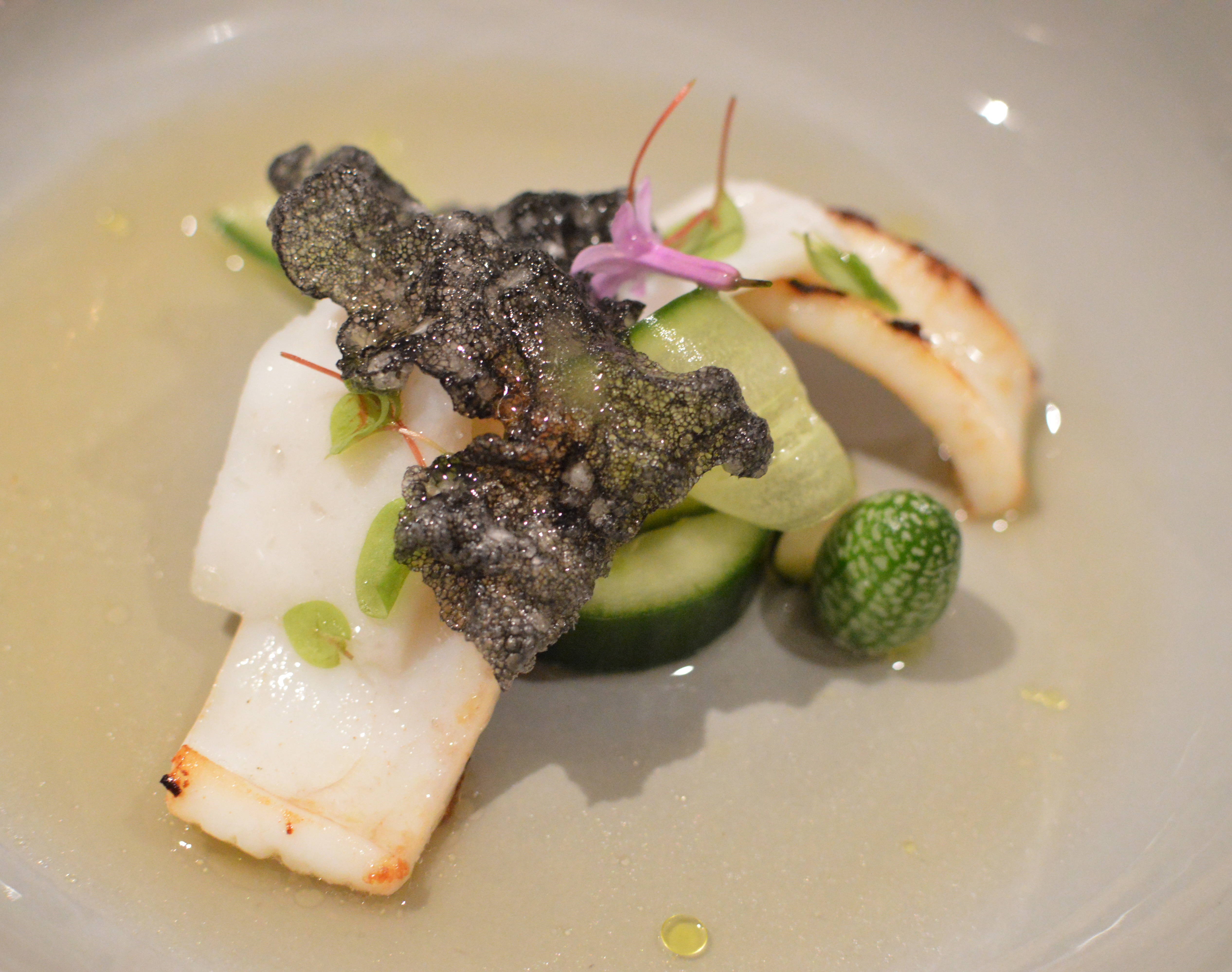 Tas Ike Jime squid w pickled & fesh cucumber, macadamia, ink & herbs of the seaArtisanal bread and cultured butter is the first marker that a duty of care is in place. It may seem like a small detail, but it forms part of the composite experience. The first course, modestly listed as a snack, was a lightly seared sea scallop served in the shell, with a subtle jamon-infused dashi, that was steeped overnight. The dish demonstrated thought, nuance, and technique; and was the ideal way to start. The next, two white asparagus stalks cooked upright, was served with goat’s milk foam and finely cut fennel garnish. Those of you who follow this blog know my thoughts on the questionable relevance of foams, but I had no such misgivings with this one. The foam had lovely consistency and balance that most importantly added a nice point of contrast.