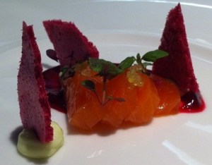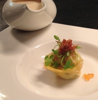 The eight course degustation ($150-$185 with optional supplements) is prefaced with quality olive oil infused with garlic, parmesan and rosemary and a trio of contrasting spices in which to enhance your bread. The Szechuan and spiced salt works best for me, but the nori flakes with bonito and sesame is an intriguing combination with the EVOO. This is closely followed by the Japanese inspired amuse bouche, a playful and elegant swordfish shooter with mirin sake and soy in a shot glass, with a soba noodle nori roll on the side. The dish has beautiful balance and is clean across the palate, but with just enough residual finish to stimulate both the taste buds and appetite for what is yet to come.