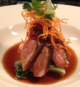 The impeccably bred Sher wagyu (marble score 8/$20 pp supplement) has sublime texture, and is complimented perfectly with an intense bordelaise sauce, punchy king brown mushrooms, silky truffled mash and some foie gras to guarantee total decadent fulfilment. Slightly over the top perhaps, but it is ‘shoot and send one to heaven’ stuff; and since I am not ready to cash in my chips yet, a succession of sighs has to suffice. Stellar slow cooked Chinese style roast duck, which totally seduces with its aromatics and smoky flavour, is seasoned right to the edge. The dish is served with green chilli, oyster sauce dressing, coconut rice and Asian greens. It provides a lovely optional directional point of difference to the previous dish, with textbook balance and comparable wow factor.