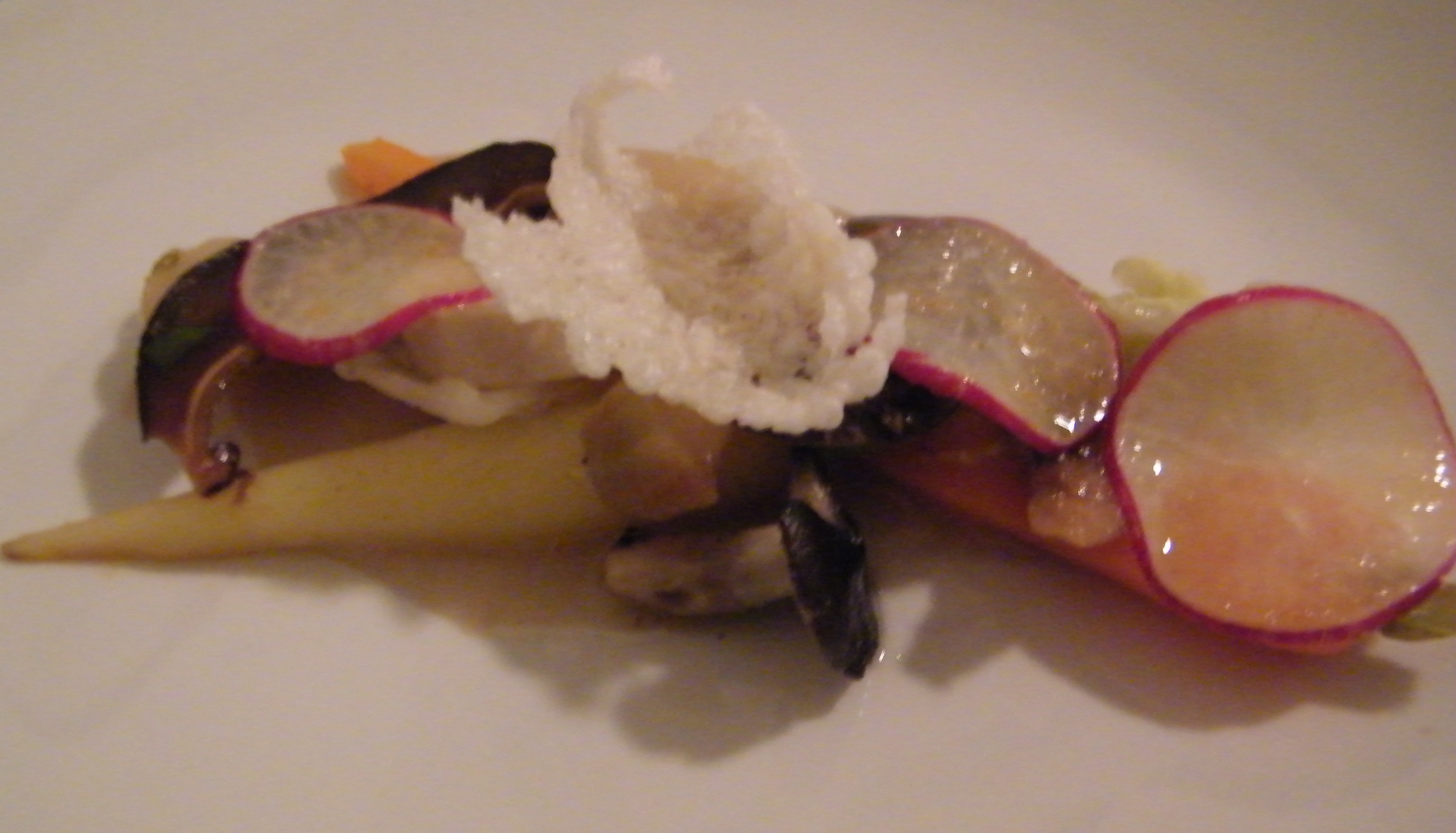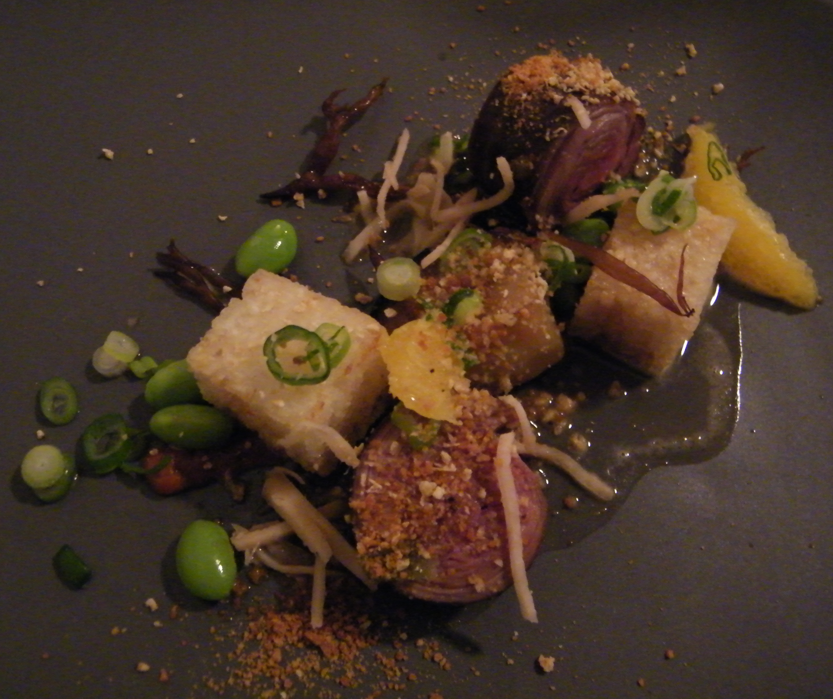 The optional amuse ($8) of ‘house-made’ silken tofu, sautéed spanner crab, balanced wasabi, ginger juice and soy; is an irresistible option to choose. Exceptional texture, balance and exquisite nuance momentarily tease the palate before dissipating with the same elegance, and is the perfect pre-cursor to Chef Michael Ryan’s intuitive cuisine. This is further exemplified with a deceptively simple yet elegant play of raw and cooked vegetables, with puffed rice and congee sauce. The nuance of temperature contrasts with sweet and sour flavours, measured pickling and a play of textures elevates an assembly of humble ingredients into a triumph of modern translation. The 2010 Hiokizakura sake enhances the natural harmony of the dish, whilst also offering background depth. The sake is clearly an intelligent matching option, but an optional wine selection is also available.