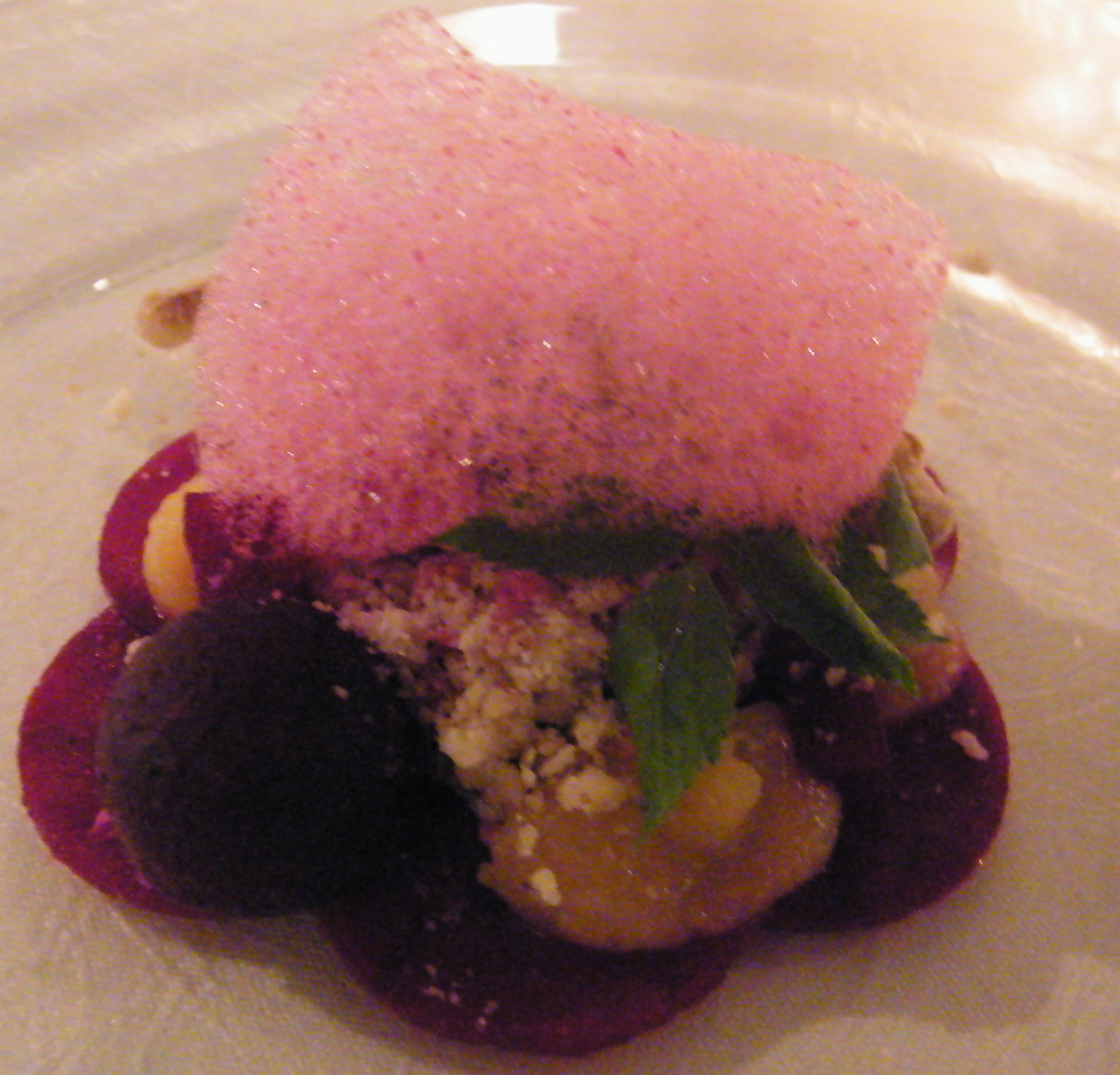 The Vietnamese salad with a nicely nuanced ginger cream is a well-balanced treasure trove of various herbs and texture that cleans and stimulates the palate, as the first element of the optional seven course degustation menu ($100 pp/$140 pp with matched wines). The restraint and lightness of touch shown is key, a quality that resonates throughout all the dishes. It is followed by textures of beetroot, a sophisticated homage to that humble vegetable, with blood orange, very subtle goat’s curd and walnut brioche, cutting across the multi layered dimensions of earthiness from the various elements. The cloud of beetroot foam adds an undeniable visual aspect to the dish, without dissipating quickly, as many often tend to do.