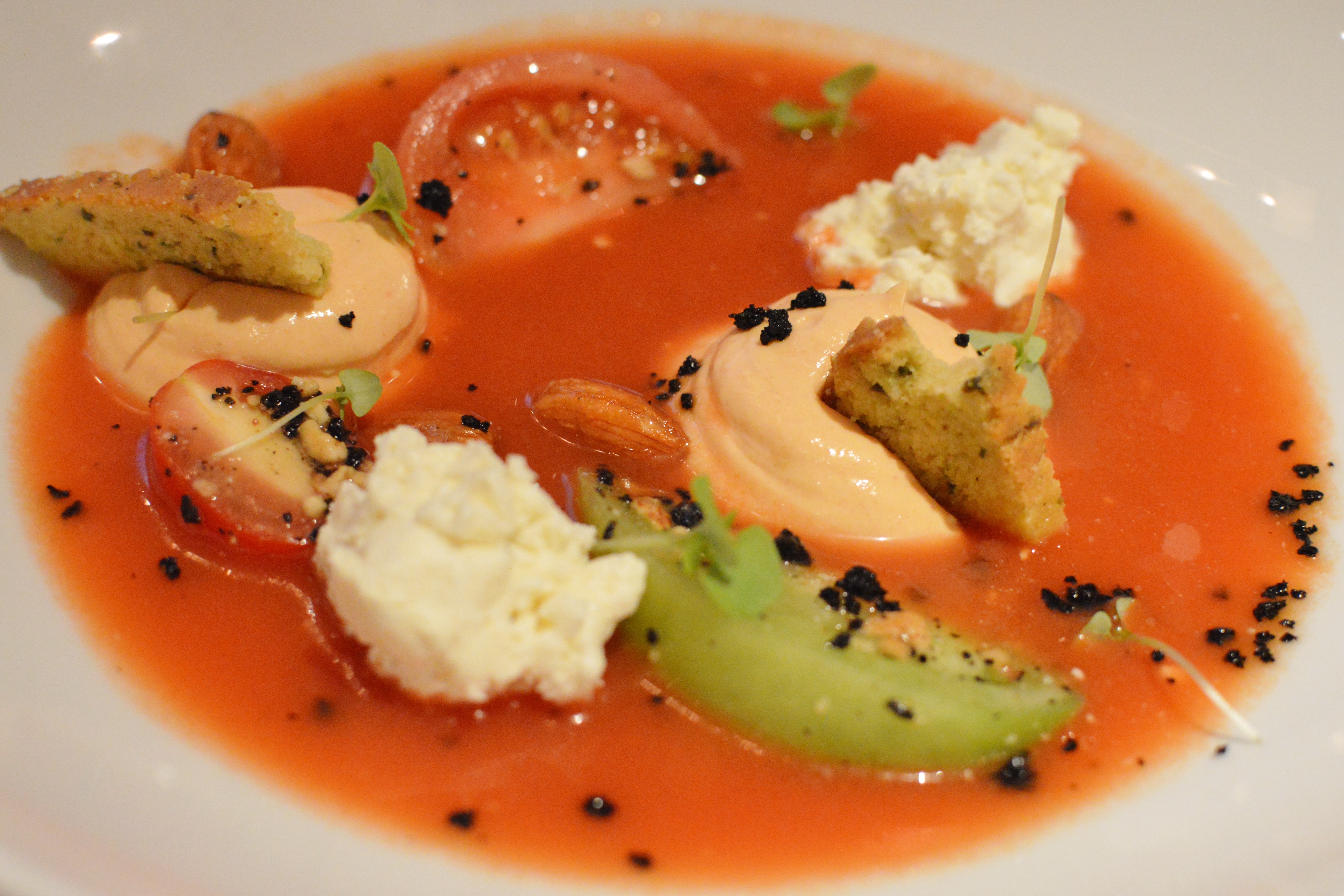 A vibrant, but not overpowering red pepper heirloom tomato gazpacho ($25), with Yarra Valley persian fetta adding just the desired level of piquancy, is served at just below room temperature. This is preferred over the usually chilled versions elsewhere. The speckling of dried olives are a nice touch, and the almonds and croutons add a nice textural contrast. Time well spent by the Chef in the UK really comes out with the roast pork belly, black pudding and crumbed pig’s tail ($25), which is a modern, technical, and tasty homage to the animal. Nicely poached enoki mushrooms both lighten the dish up, whilst offering an innovative textural contrast, alongside the butternut puree, crispy sage, and crackle.