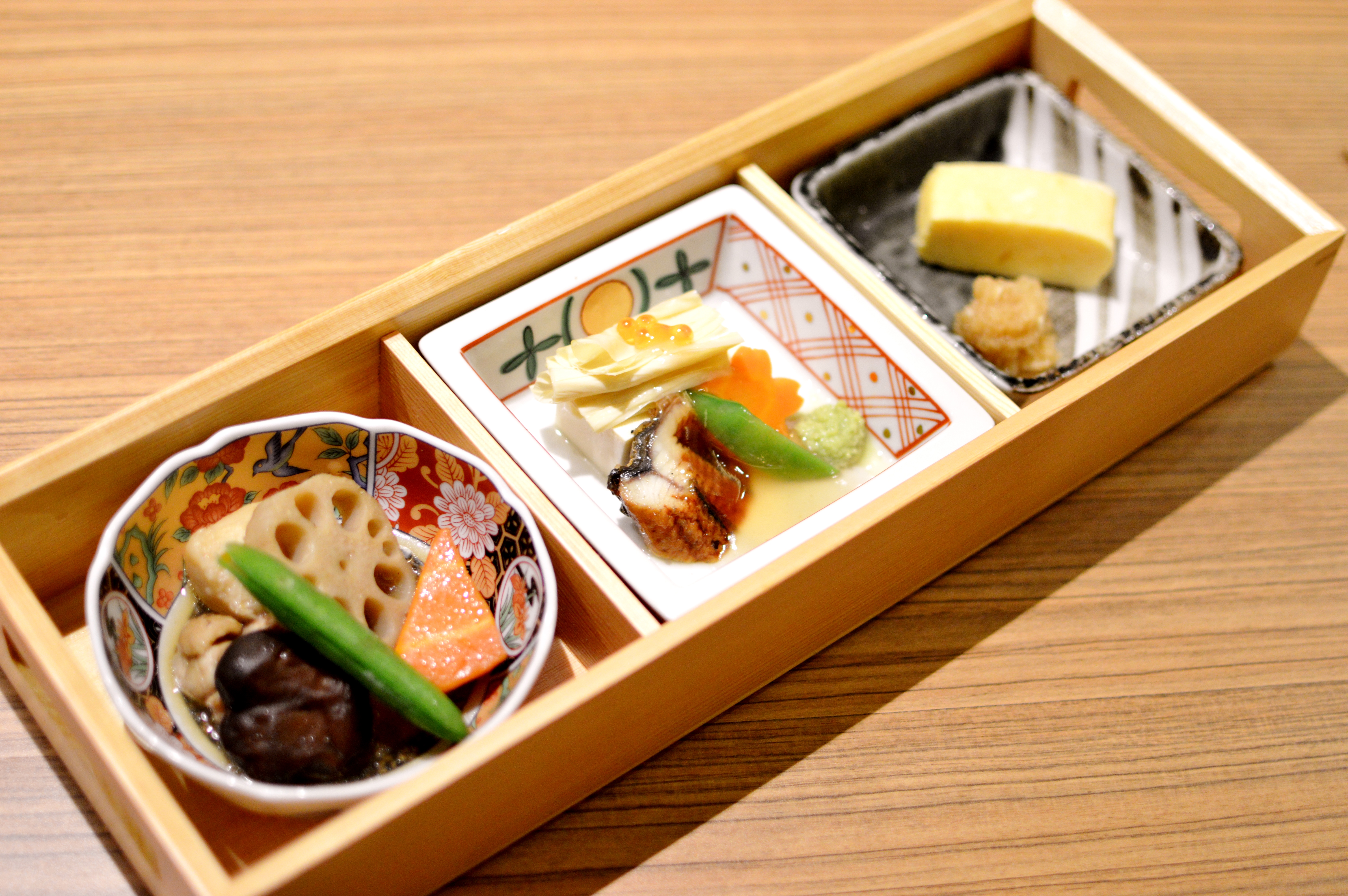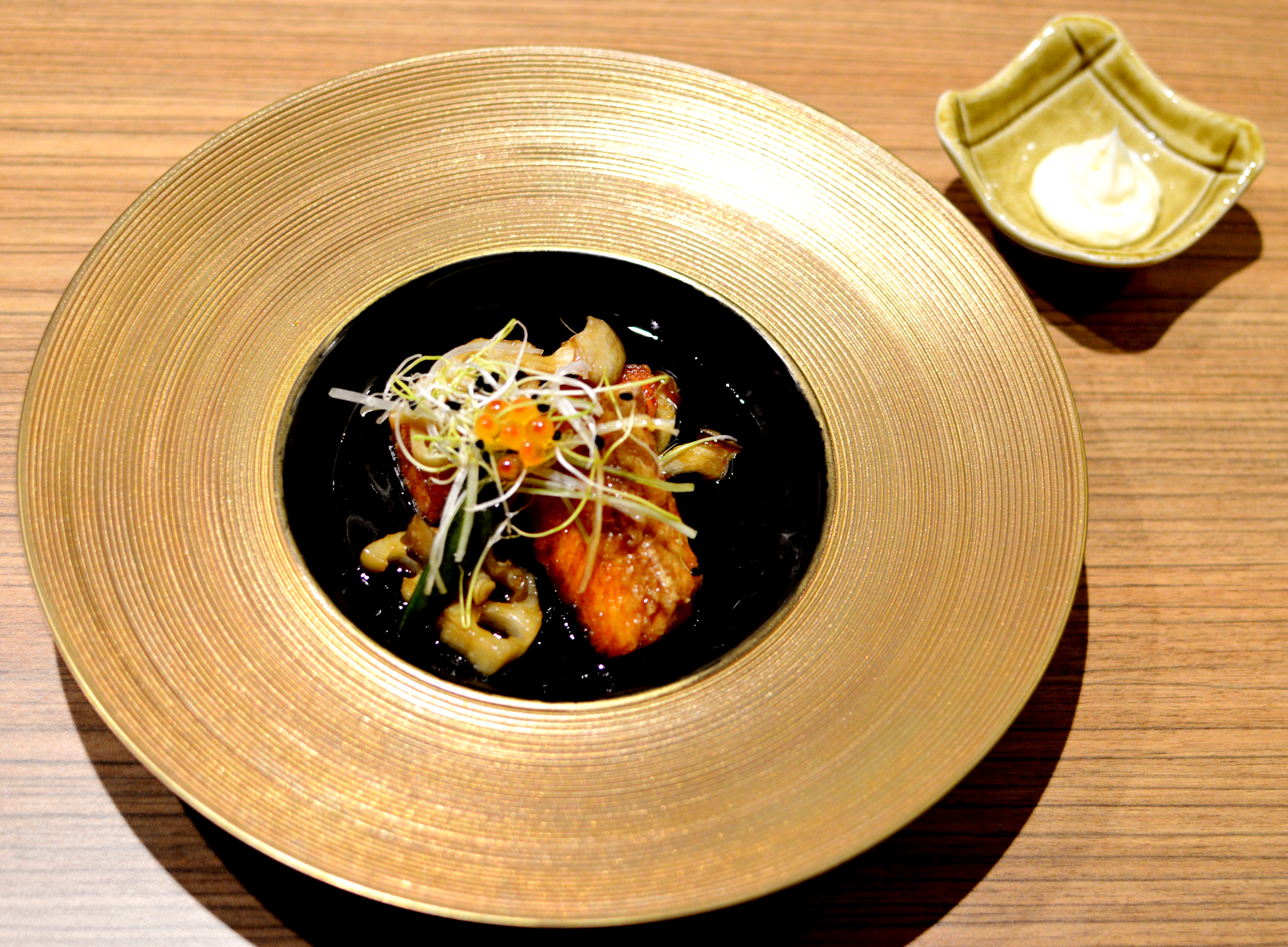 The Kayaba menu starts with Zensai Santen Mori (a trio of assorted appetisers), the first Chikuzen-ni (braised chicken and vegetables), is underpinned by a light well-balanced broth. Tofu topped with yuba follows (tofu skin made during the boiling of soy milk), paired with texturally perfect eel and a punchy hit of wasabi. Lastly, flawlessly layered