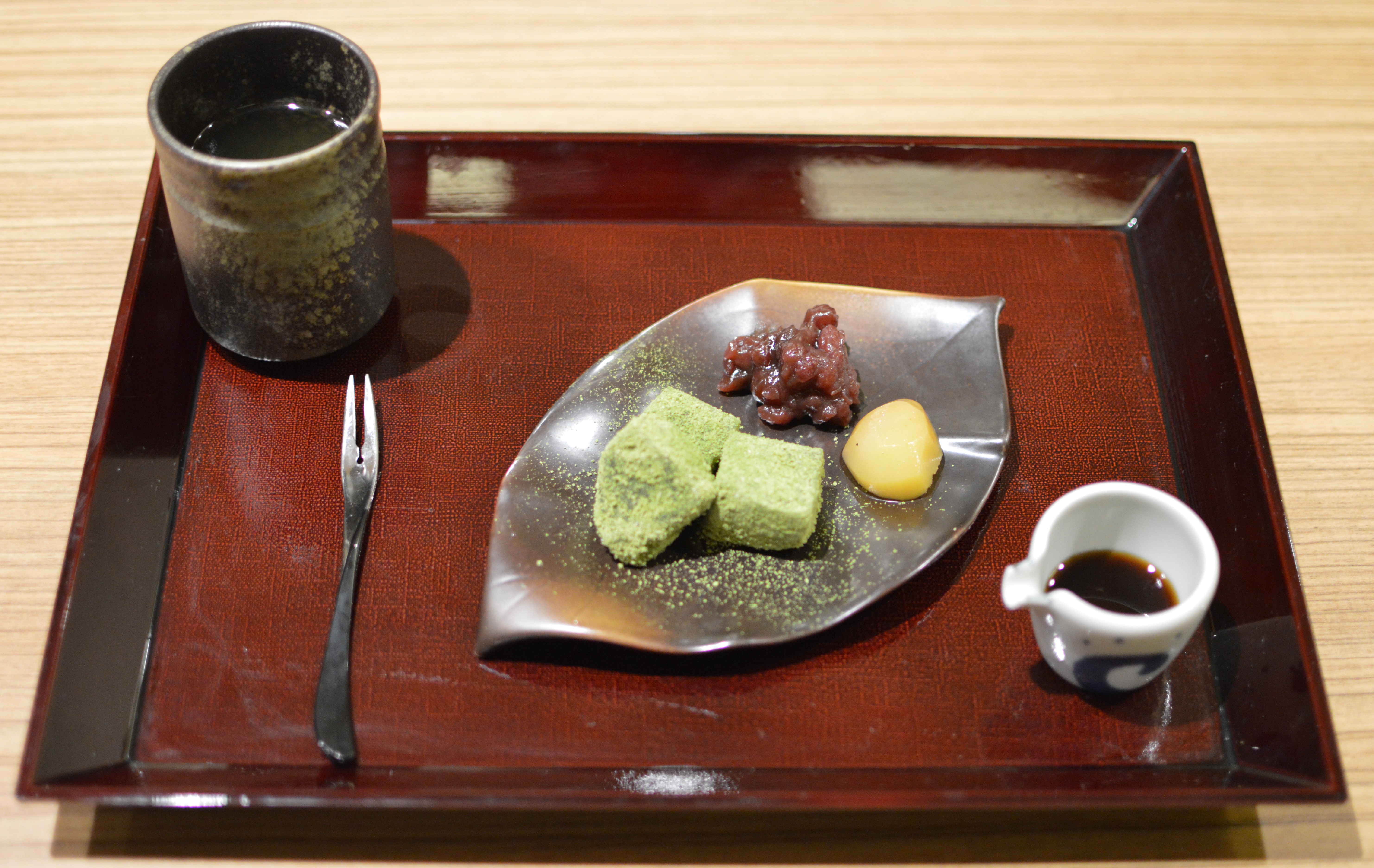Matcha ice cream with whipped cream and strawberries is a simple dessert with clean flavours. Warabi mochi (wasabi jelly, Uji matcha from Kyoto, red bean and chestnut) is my preference of the two, more a petit four than a dessert, but well executed nonetheless. Both come with tea from a well-chosen list that represents the pick of the tea producing regions of Japan.